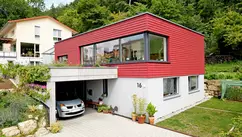 Geradlinig und klar in der Form, aussagekräftig in der Farbgestaltung, hell und lebendig im Inneren. Das Haus Breitenbach gehört mit seinem Flachdach zu den angesagtesten und modernsten Entwürfen unserer Zeit. Reduziert auf die kubische Grundform braucht es nichts mehr, als nur sich selbst, um den Betrachter in seinen Bann zu ziehen. Hierbei wirkt das Erdgeschoss, sowohl in Farbe und Material abgesetzt, schlank und elegant. Die schicken Fensterflächen über Eck sind optisch ein Blickfang und lassen viel Licht ins Haus. Den ganzen Tag.